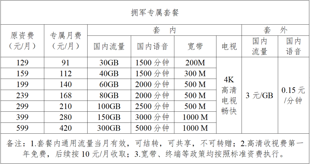 1.全市各联通网点,面向现役军人、持优待证的退役军人和“三属”,办理个人终端业务,新老用户均可享受7折拥军专属套餐优惠服务;