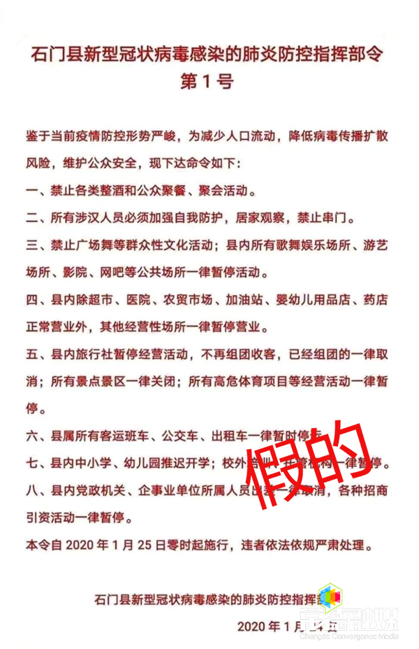 1月25日10时许,石门县公安局网监大队民警在网络巡查工作中发现,一份名为《石门县新型冠状病毒感染的肺炎防控指挥部令第1号》的文件在该县多个微信群和朋友圈流传,经办案民警与石门县政府工作人员核实,流传文件为不实信息。