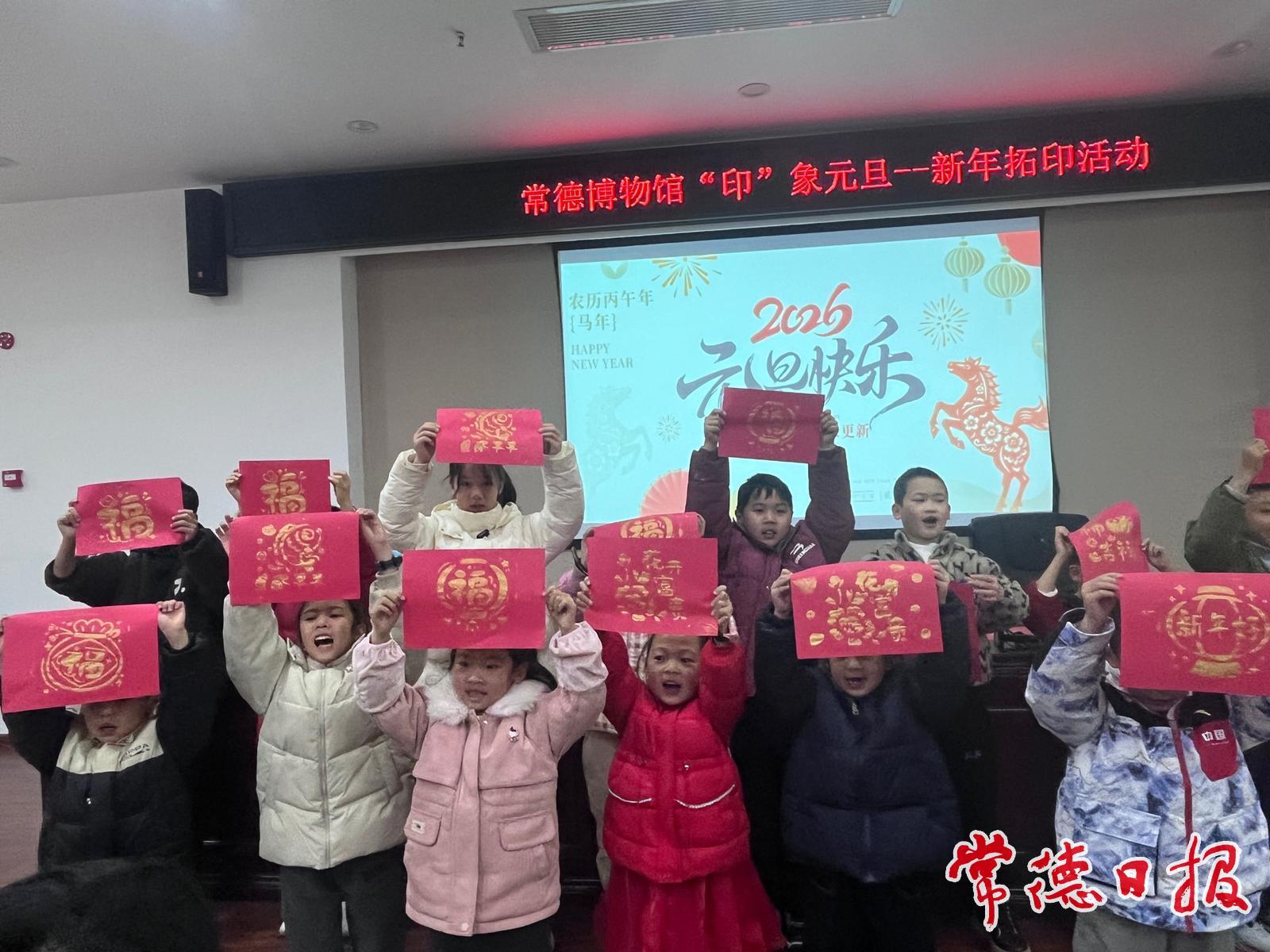 “举办‘印’象元旦拓印活动,初衷是让孩子们在辞旧迎新的特殊节点,通过亲手体验非遗技艺,感受传统文化的魅力。”博物馆工作人员告诉记者,传统文化的传承需要鲜活的载体,拓印动手性强、趣味性足,能让孩子们直观触摸历史的纹理,在金粉与纸韵中培养文化自信。“我们还会推出更多此类社教活动,让文物‘活起来’,让传统文化浸润更多孩子的心灵。”工作人员介绍,为丰富市民元旦假期文化生活,让更多人感受历史文化魅力,1月2日10时至11时,他们将持续开展《常德历史——史前探源》《常德历史——墟中觅史》《常德历史——汉后擷珍》公益讲解,带观众探寻常德千年历史脉络;1月3日10时至11时,《悲壮抗战英雄城——日军常德细菌战暨中日常德会战》专题展公益讲解将如期举行,通过珍贵史料让观众铭记历史、珍惜当下。