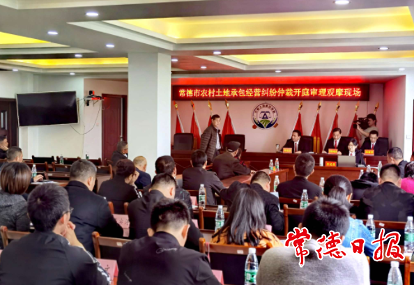 4月28日上午9时,一记法槌声在鼎城区郭家铺街道孔家溶社区敲响,全市首场农村土地承包经营纠纷仲裁开庭审理现场观摩会在此召开。