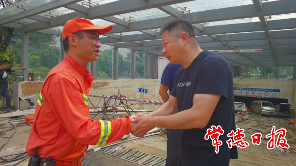 当地居民紧紧握住常德消防增援队伍指战员的双手,为他们排涝抢险表示感谢