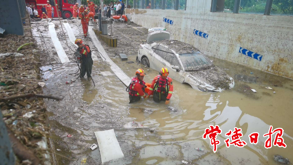 常德消防增援队伍帮助居民将车辆从地下车库推出