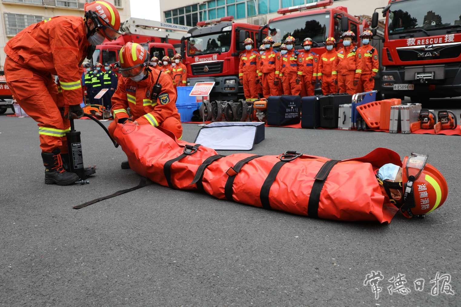 消防员模拟“躯体固定气囊”救援演练