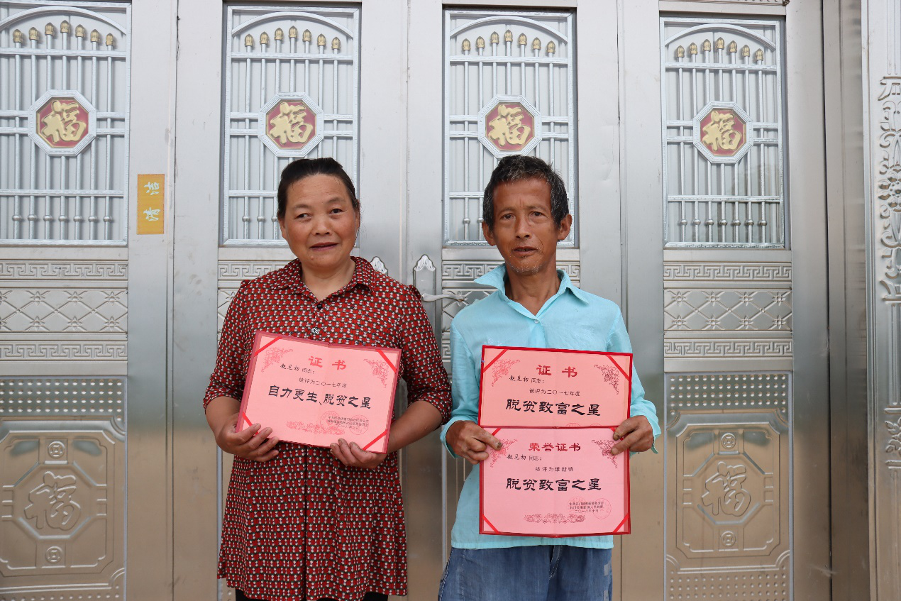 赵见初一家曾是贫困户,夫妻俩都身有残疾,赵见初肢体二级残疾,妻子双目失明,生活举步维艰。近几年,在政府的帮扶下,赵见初夫妇不等不靠、自力更生,盖牛棚、养土鸡,日子越过越好,已是远近闻名的“脱贫致富之星”。