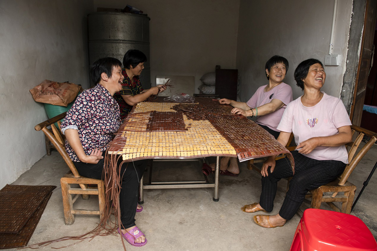 用勤劳的双手实现脱贫致富梦。贫困户张阳春的老婆刘阳正在编织凉席,厂里送货到家门口,在家串一袋珠子就有60多元的收入,凉席编织好后厂里又有人来收,足不出户就可有效增收。张阳春2016年就已顺利脱贫,今年还做了村里的保洁员,一年增收6000元以上。