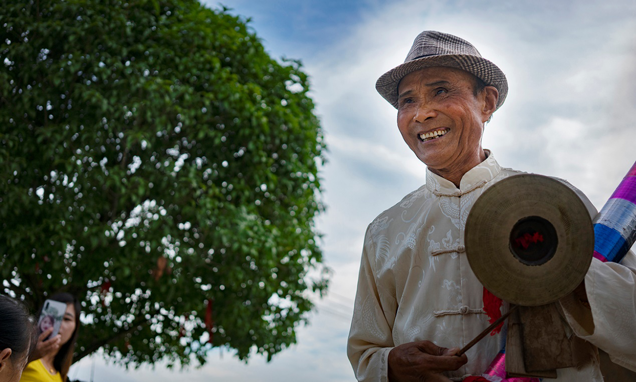 “大地回春气象新,党旗飘飘民心顺,攻坚为脱贫,脱贫致富报党恩……”今年82岁的渔鼓传承人张桃初老人表演原创鼓曲《脱贫致富谢党恩》,心中有党的农民艺术家表演精彩生动,现场村民一个个看得聚精会神。