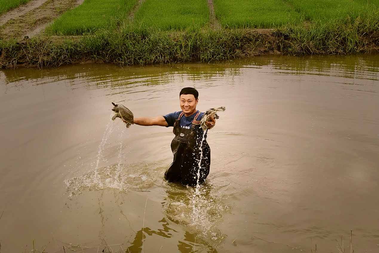 稻鳖共养双丰收,走出致富新路子。上河口村千亩洲稻鳖养殖合作社负责人杨波一脸喜悦地从养殖池里举起生态鳖,这位“返乡青年”的合作社带动贫困户56户149人,生态米、生态鳖供不应求。中间种稻,两边养鳖。贫困户范有才2018年种植荠米6亩顺利脱贫,去年扩大规模种植25亩荠米净赚10万元。