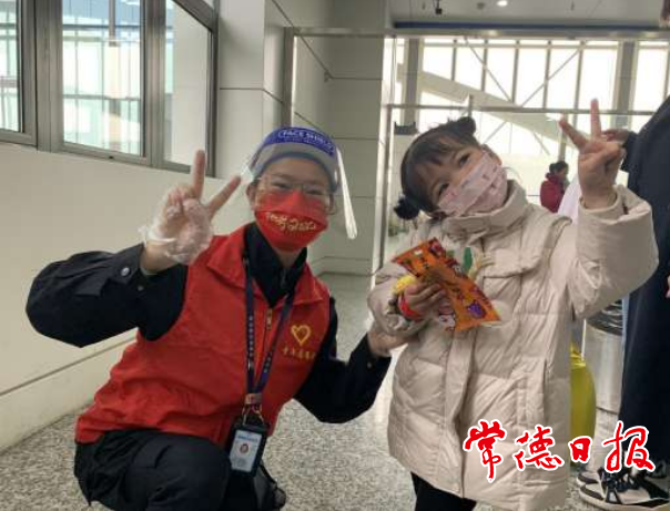 桃花源机场,志愿者为小旅客提供服务
