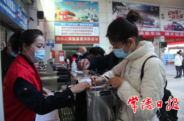 常德汽车总站,志愿者指导旅客进行实名制登记