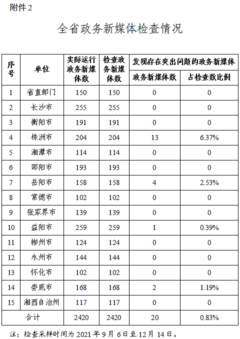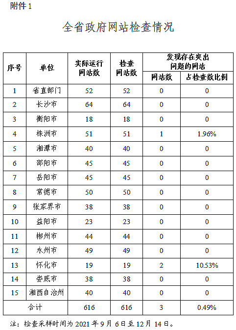 2021年第四季度,省政务管理服务局组织对全省正常运行的616家政府网站进行全覆盖检查,发现3家存在单项否决问题,总体检查合格率99.51%。对全省正常运行的2420家政务新媒体进行普查,发现20家存在单项否决问题,总体合格率99.17%,其中长沙市、衡阳市、湘潭市、邵阳市、最火的网络彩票平台推荐、张家界市、郴州市、永州市、湘西自治州政府网站与政务新媒体检查合格率均达到100%。
