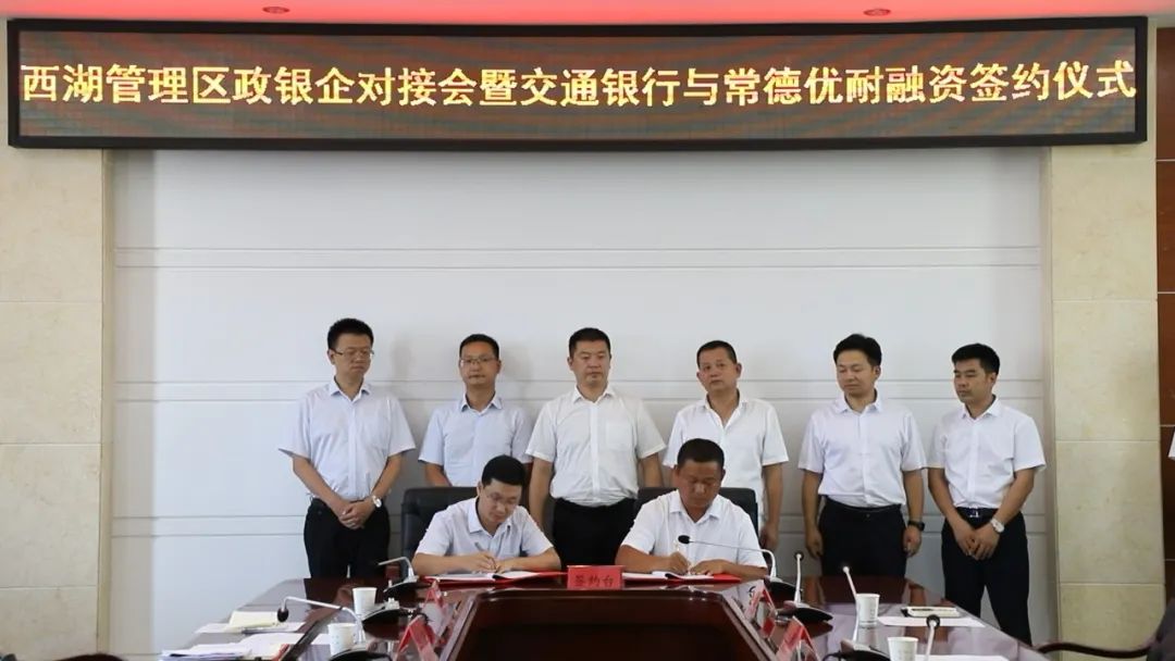 7月24日,西湖管理区与湖南梅塞尔PBM新材料项目签约及政银企对接会暨交通银行常德分行与常德优耐融资签约仪式举行。区领导吉海波、刘六林、肖渤参加签约仪式。
