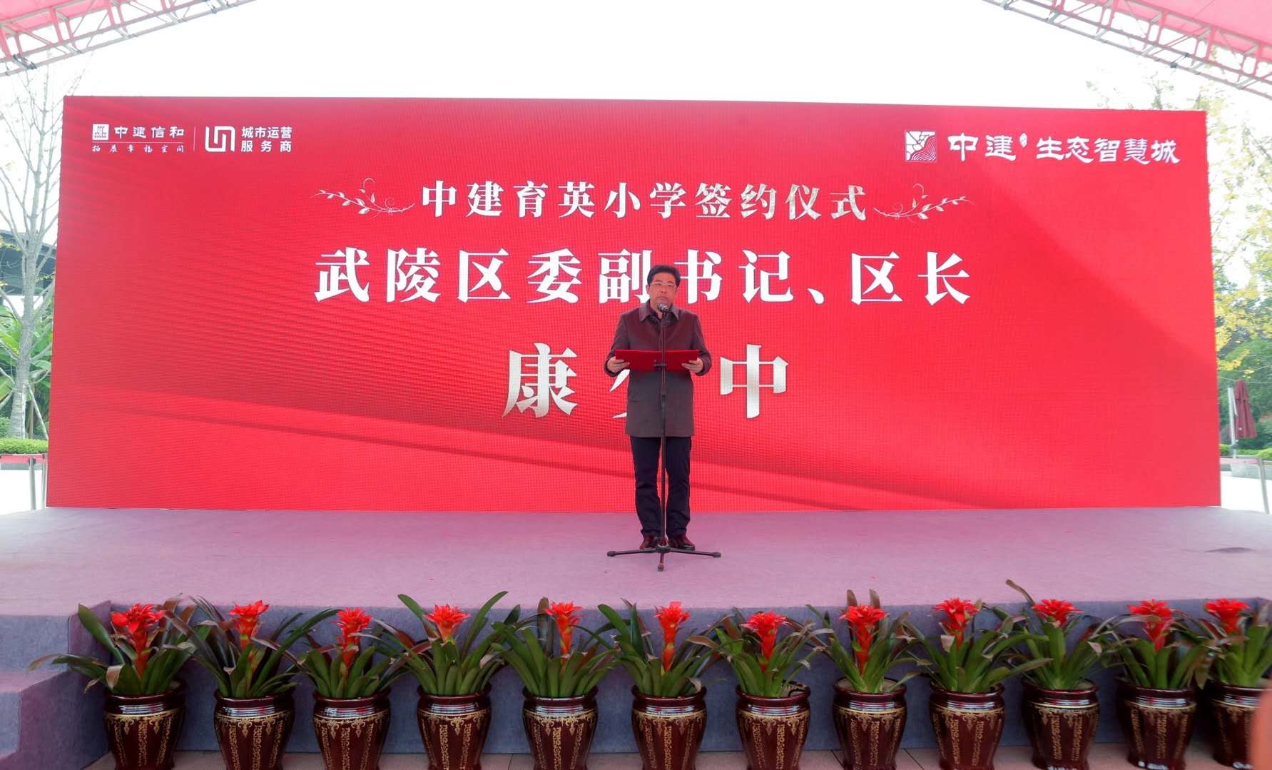 签约仪式上,康少中致辞,他说,近年来,武陵区委、区政府始终坚持“更大投入、更加均衡、更高质量”办好武陵教育的理念,累计投入资金近10亿元,高标准建成城区小学4所,改扩建公办幼儿园5所、城乡薄弱学校15所,新增义务教育阶段学位近万个。今天签约的中建育英小学项目,既是武陵教育均衡布局的重要板块,也是中建信和公司积极履行社会责任的具体体现,项目建成后将极大缓解区域就学压力,公司要严格按照合同约定,坚持高起点规划、高标准设计、高质量建设,武陵区相关部门要靠前服务,全力为项目建设保驾护航。