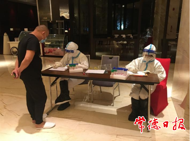 在武陵区新冠肺炎疫情防控指挥部调度下,武陵区疾控部门联合公安、街道、社区等部门对喜来登酒店进行了封控。与此同时,由武陵区疾控中心张志刚副主任带队的第二队人马迅速赶往喜来登酒店开展核酸采样。