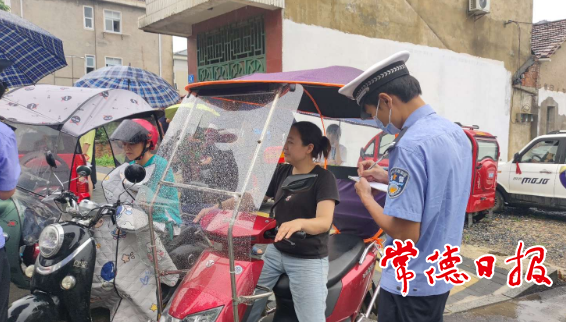 在西洞庭一中、中心完小、中心幼儿园等学校路段,工作人员对过往家长骑乘电动自行车不戴安全头盔、非法载人、非法加装雨伞、逆行等交通违法行为进行分类劝导,并发放交通安全宣传手册。