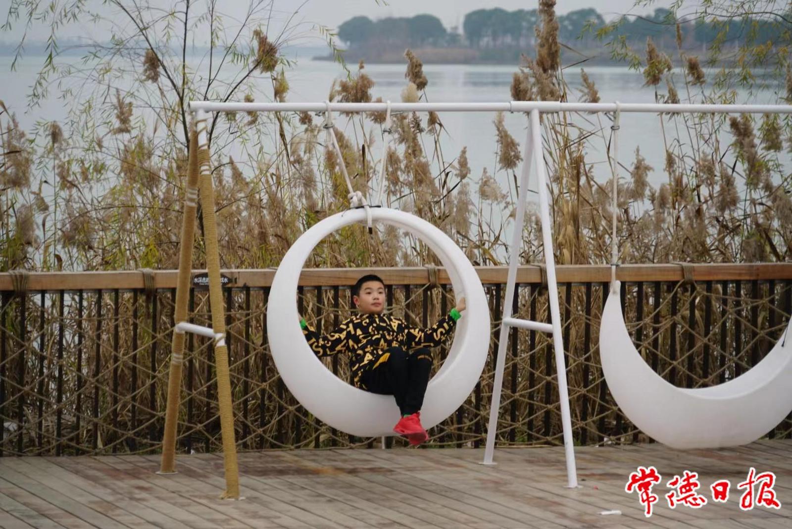 不少游客在营地内散步。走进柳叶湖渔歌艺术营地,伴随着悦耳的常德丝弦,一个个红色的鱼形灯笼映入眼帘,烘托出春节的喜庆氛围;营地内的建筑采用仿古风格,茅草铺顶、连排成片,勾起了“老常德”的儿时回忆;草帽形状的垃圾桶盖、躺卧在草坪上的小熊猫雕塑、素朴简约的白色帐篷,这些巧思设计与碧水蓝天相映成趣,形成一幅美丽画卷,让游客流连忘返。