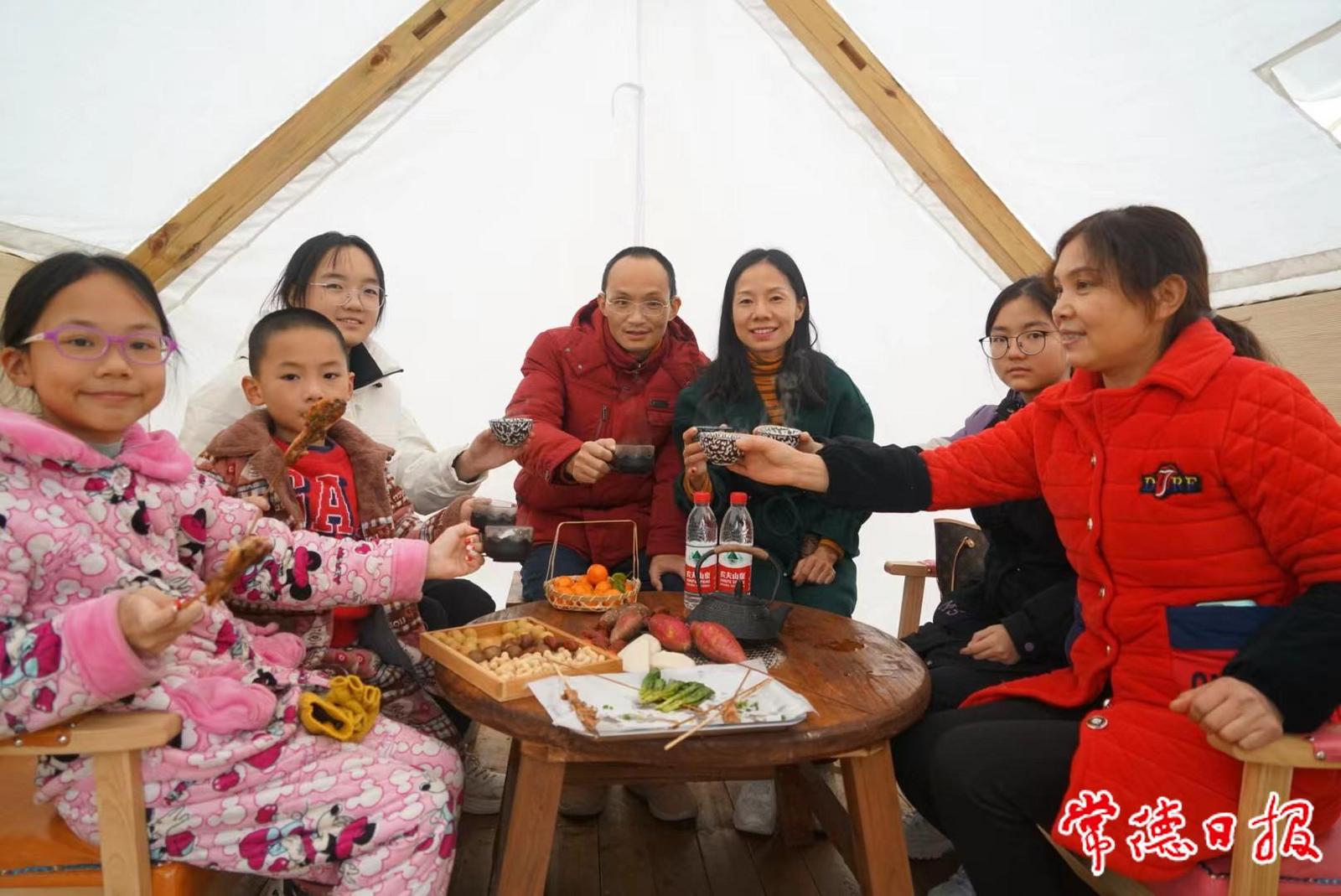张女士一家围炉饮茶。营地的渔歌唱晚清吧也十分热闹。负责人顾女士告诉记者,这两天围炉饮茶、围炉饮酒的帐篷都是爆满,预定都没有位置。渔歌唱晚清吧周边有十多个帐篷,帐篷内火炉上烫一壶热茶,烤着红薯、糍粑、红枣等小吃,一家人十分惬意。张女士在深圳工作,已经3年没回家过年了。这次回家听说柳叶湖渔歌营地春节不打烊,她就带着一家人过来玩一趟。“我是从小在柳叶湖边长大的,没想到3年不见,柳叶湖变化这么大。”张女士说,现在常德发展太快了,再过几年,她也考虑回家乡发展。
