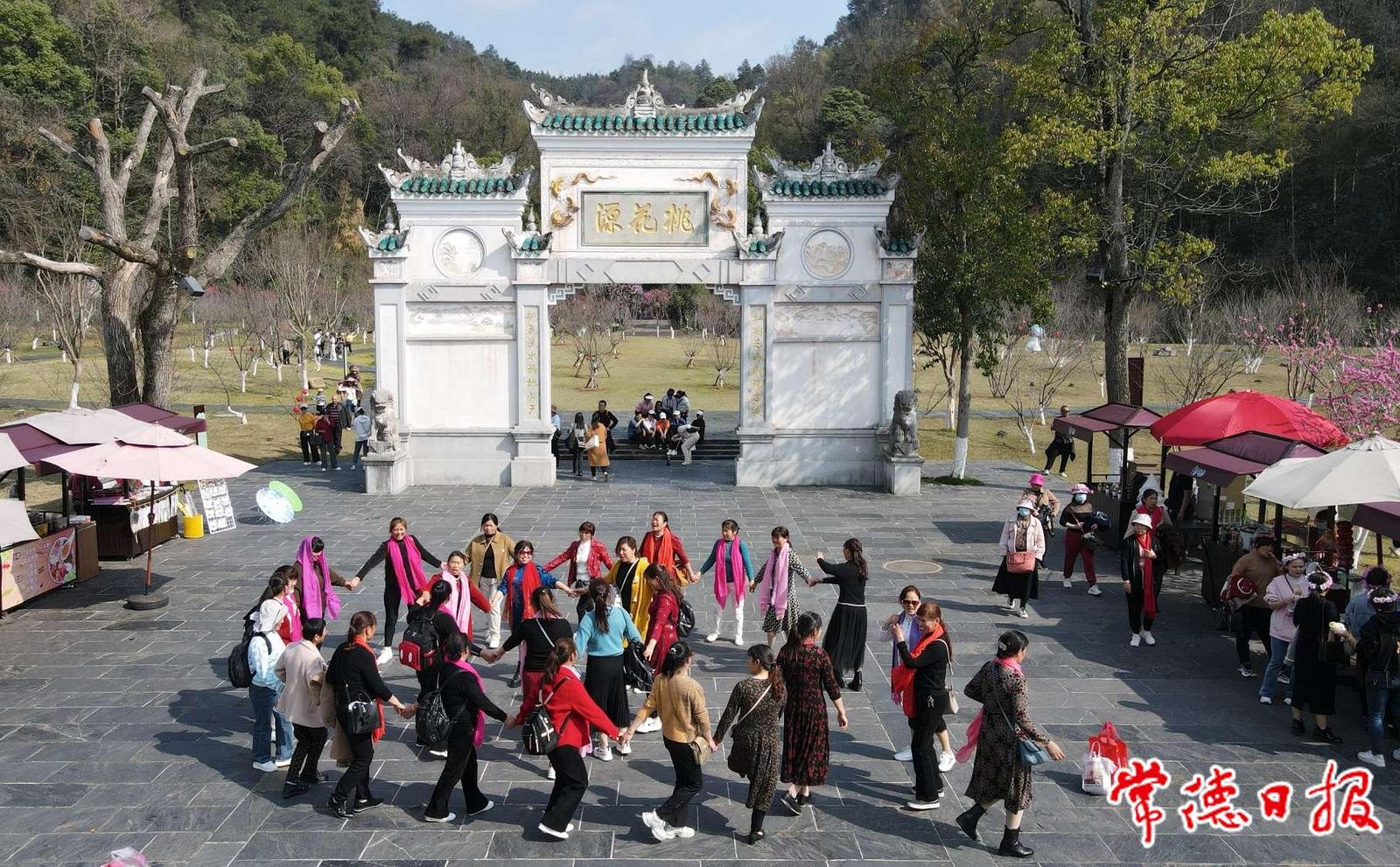 来自宁乡市的游客在桃花山牌坊前跳起了欢快的舞蹈