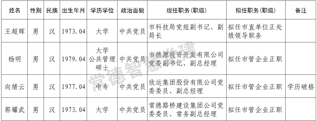 为了加强对干部选拔工作的监督,提高识别和任用干部的准确程度,现对市委常委会会议研究决定的下列拟任人选(候选人人选、提名人选)进行任前公示: