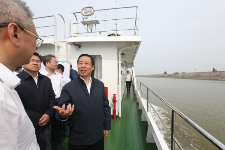 许达哲与各位河长一起伫立船头巡河,比对洞庭湖区水利工程图,现场查看湘江、资江河流整治情况。详细了解安全防汛及江岸整治采砂和生态复绿等情况。