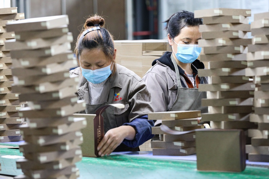 4月22日,湘西经济开发区三湘印务有限责任公司,工人在有序加工包装盒。近段时间以来,当地相关部门在做好新冠肺炎疫情防控的同时,积极协调解决资金、招工、物流等问题,扶持扶贫车间全面复工复产,帮助贫困户稳就业、稳增收。