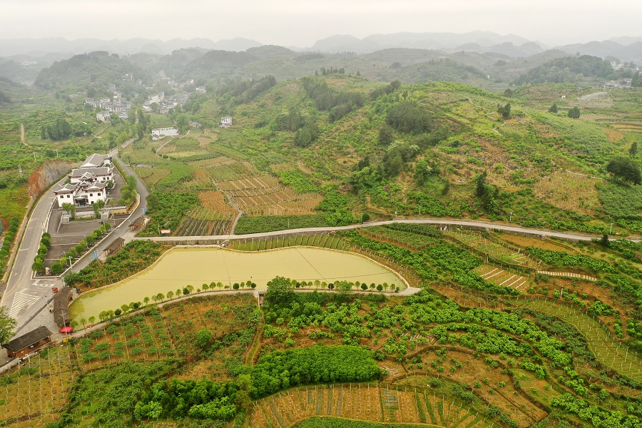 5月8日,俯瞰凤凰县廖家桥镇菖蒲塘村。该村在推进精准扶贫的具体实践中,高举党建引领大旗,以水果产业发展为重点,以村企联建、大户带动、结对互助、保障兜底等为主要举措,探索出了一条脱贫致富的特色路子。