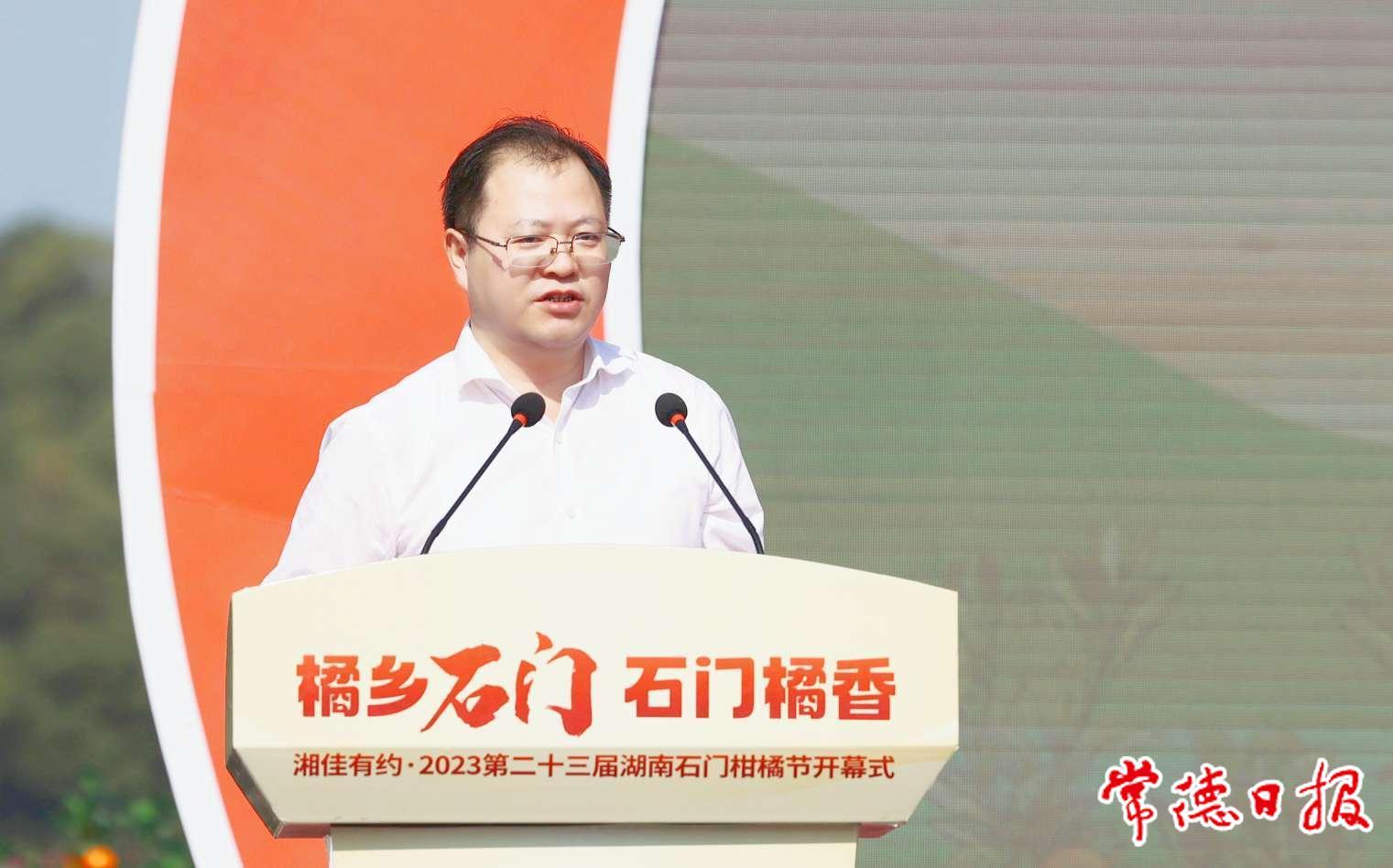 “衷心希望石门县以此次柑橘节的成功举办为契机,加快推动柑橘、茶叶等特色产业高质量发展,为全市打造农产品精深加工千亿产业集群作出更大贡献。”周振宇指出,近年来,常德深入实施乡村振兴提速专项行动,加快推动农业农村现代化,因地制宜打造“一县一特”“一乡一品”,培育了以石门柑橘、汉寿甲鱼、澧县葡萄等为代表的一大批优势产业和优质品牌,以湘佳牧业等为代表的110家国省级农业产业化龙头企业,2022年全市农产品精深加工业产值达800亿元。