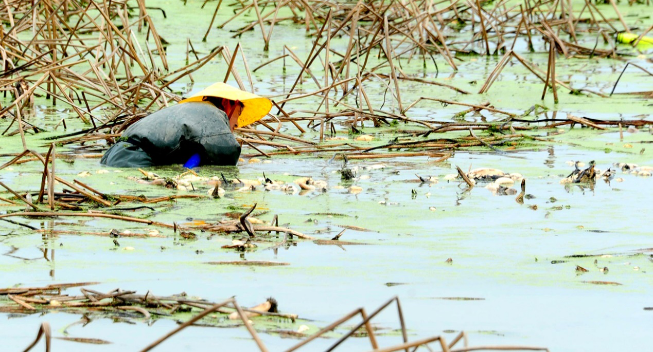 莲藕敲开致富门,荷塘传来欢笑声。