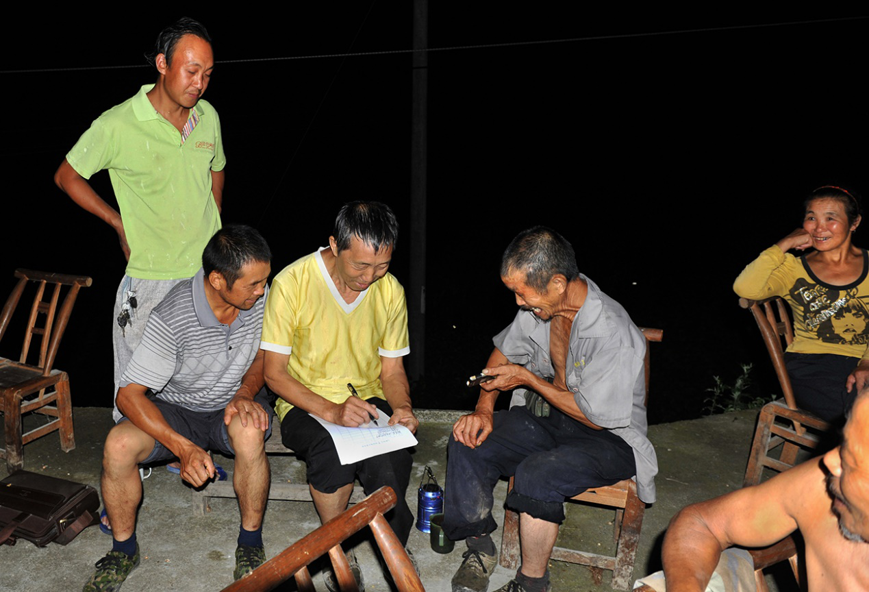 夏夜傍晚,九岭村召开“屋场会”,驻村工作队员和村干部向村民汇报扶贫资金项目落实情况,村民在帮扶相关项目书上签名。