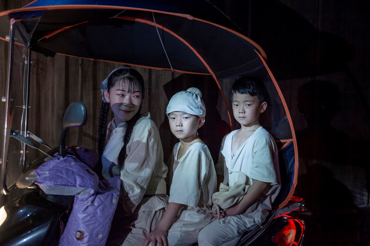 7岁的双胞胎兄弟杨志帅、唐智慧在“私塾”和“耕种丰收”两个场景中开开心心“边玩边演”,剧终人散跟“桃花妹”妈妈回家。