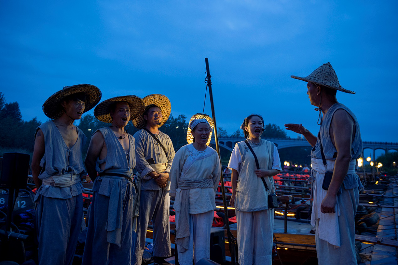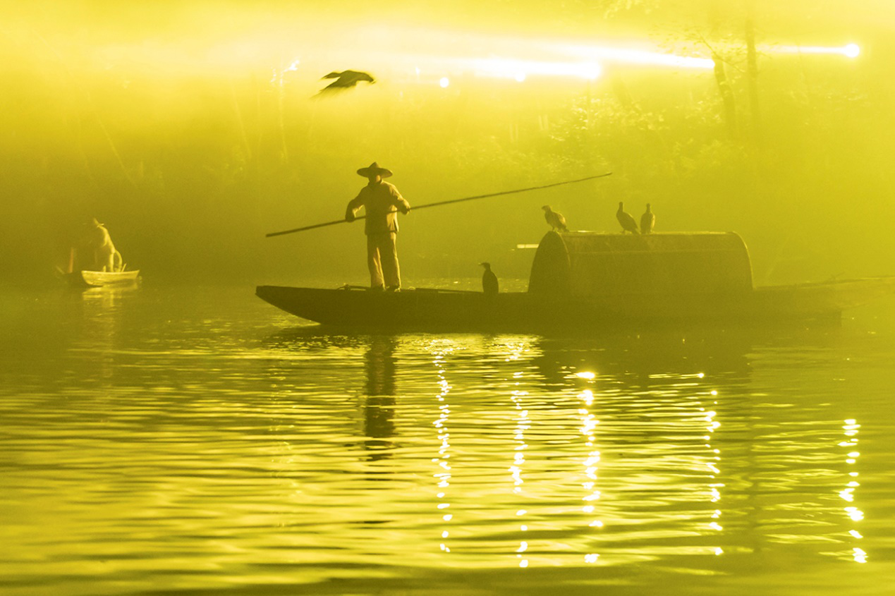 57岁的渔民彭民强带着鸬鹚出演“渔歌互答”前花了6个月时间重新训练自己的“助演”:不仅要习惯夜晚演出时的灯光,还要习惯每次下水后“一无所获”。以前,彭民强每天要在水里劳作五六个小时,如今一场演出只需要一个小时,他还用演出挣到的钱开办了“渔家乐”活鱼馆。
