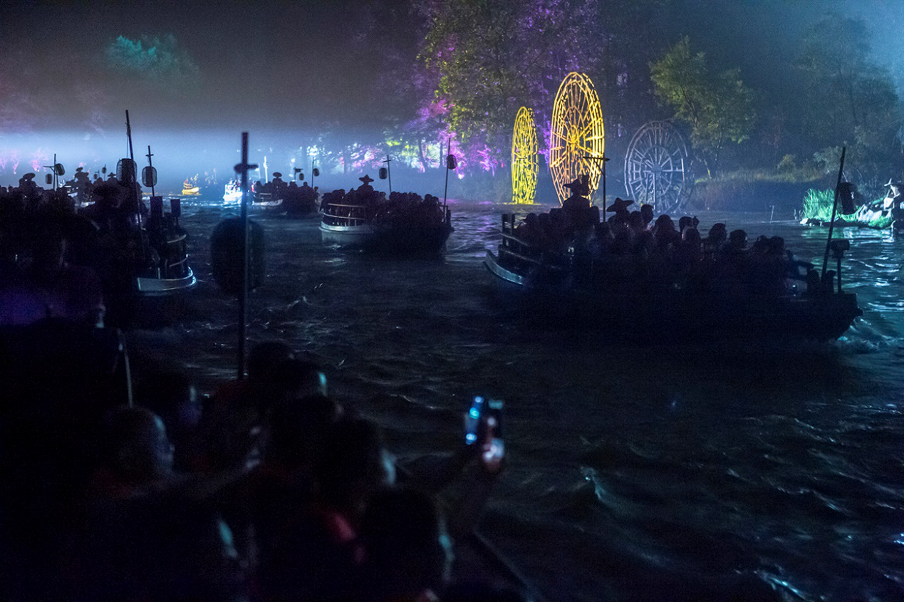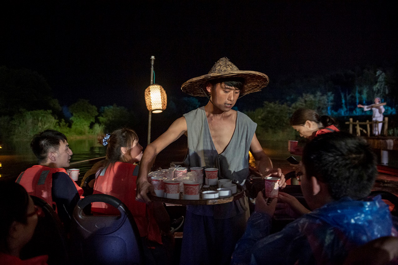 在陶渊明《桃花源记》里描绘的世外桃源原型地——湖南常德桃花源风景名胜区,大型溪流漫游实景演出《桃花源记》近4年来直接帮助当地130余户农民家庭实现稳定脱贫。实景剧“舞台”长达4.6公里,位于一条叫作秦溪的河流两岸,游客坐船观看演出。