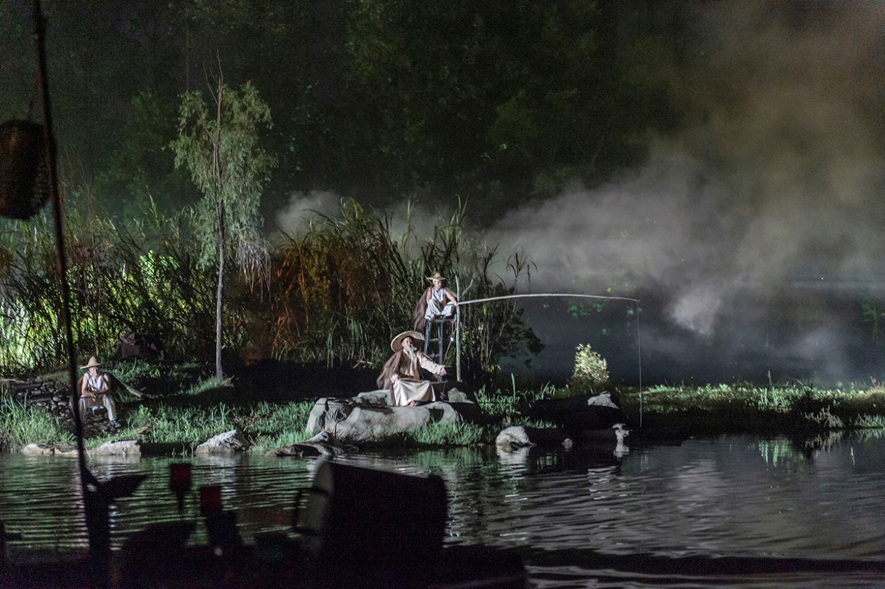 54岁的刘明祥每天晚上头戴斗笠、一瘸一拐赶着羊群在溪水流过的草地上“演自己”,妻子王美珍协助赶羊、养羊,每晚有150元的“出场费”。独子刘刚文化偏低,外出打工不易,回家后被安排到游船上当“渔郎”。