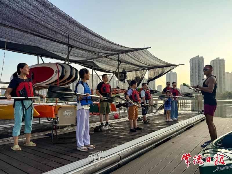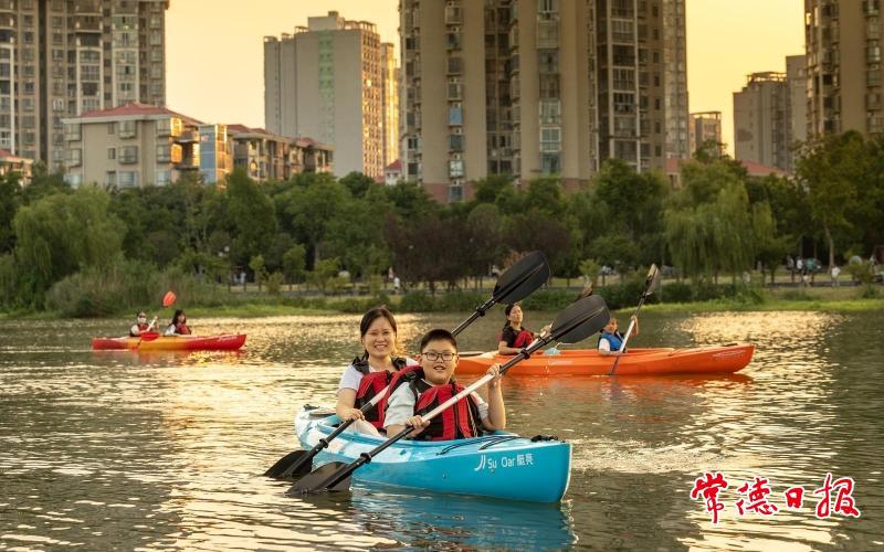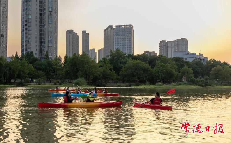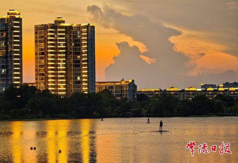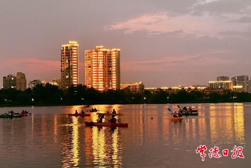 7月13日傍晚,随着夕阳西下,艇亮水上俱乐部迎来众多市民与游客。人们驾着小船驶入清澈河面,清风徐徐拂面而来,整片天空被橙紫色的落霞温柔浸透。粼粼水波倒映漫天云霞,与轻巧的舟影交相辉映,仿佛一幅流淌于天地间的天然油画,游客们悠然地沉浸其中,用最惬意的方式体验着属于常德夏日的诗意画卷。