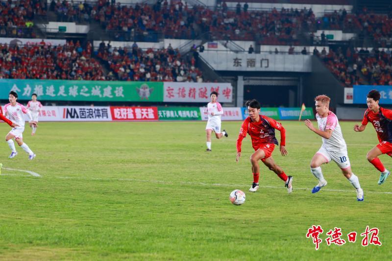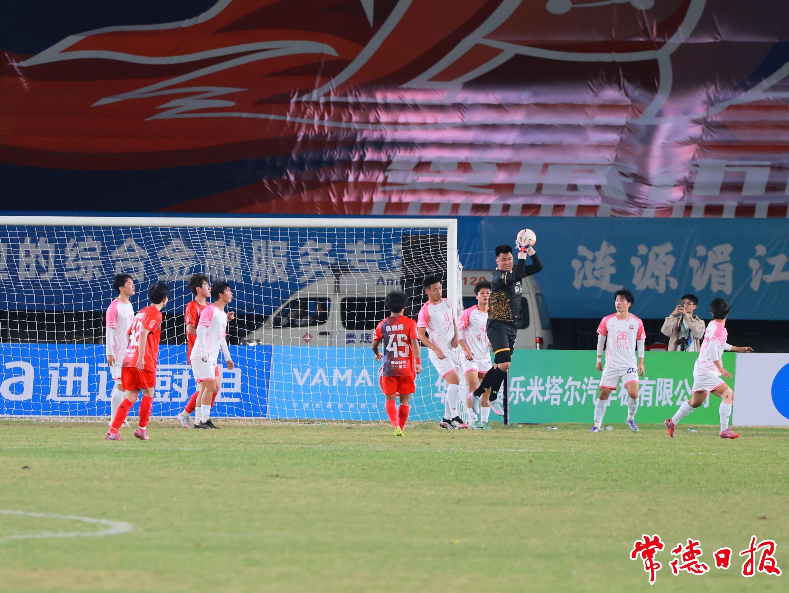 比赛转折点出现在第53分钟:常德队赵文荻射门被扑出,26号夏宇航如猎豹般插上补射入网,这粒进球也成为全场唯一进球。此后,娄底队掀起一轮又一轮的反扑浪潮,常德队门将王峰琦多次飞身救险。