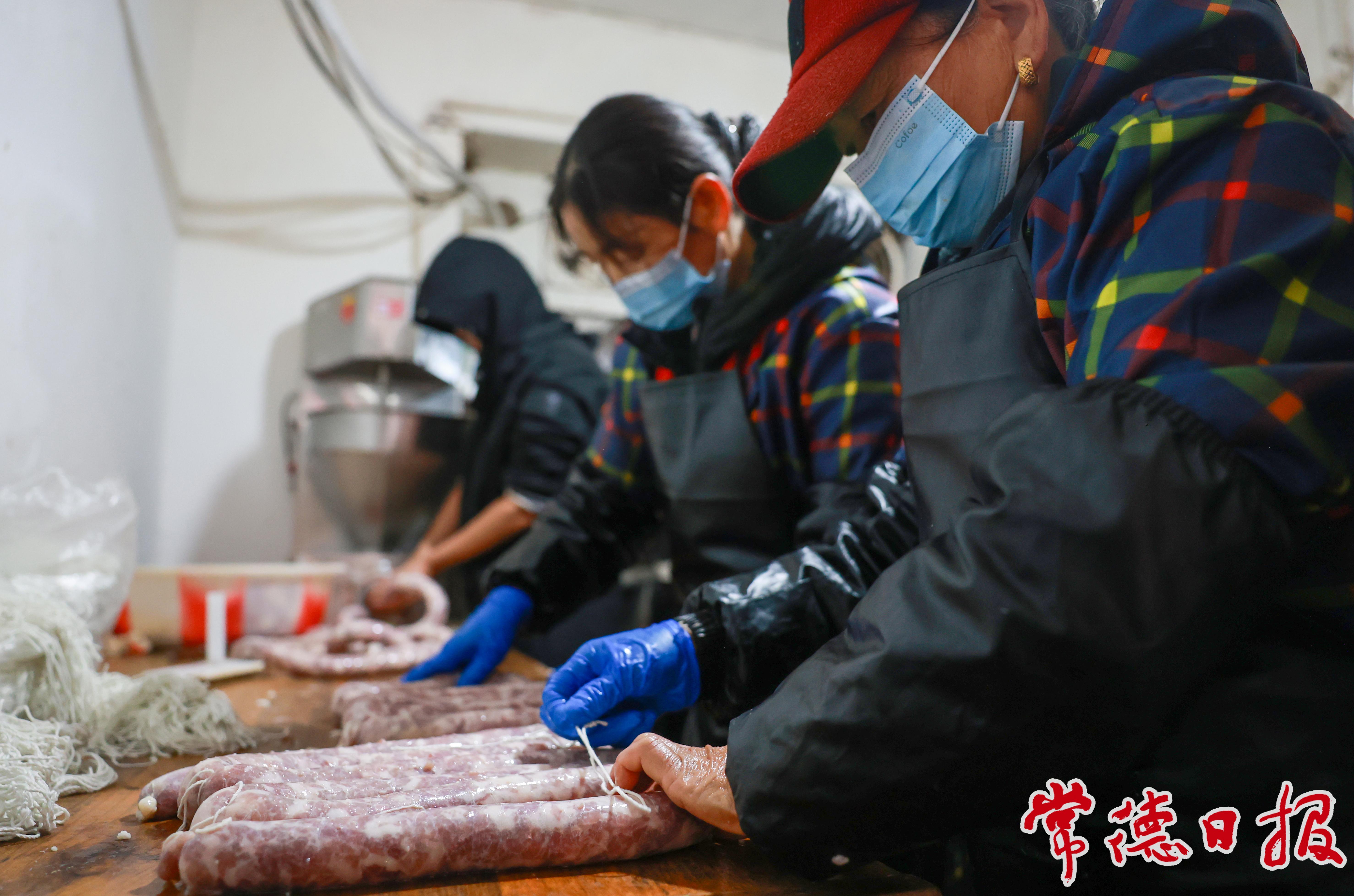 店员熟练地拿起灌好的香肠,手指灵活地穿梭,用绳子为香肠系上一个紧实的结