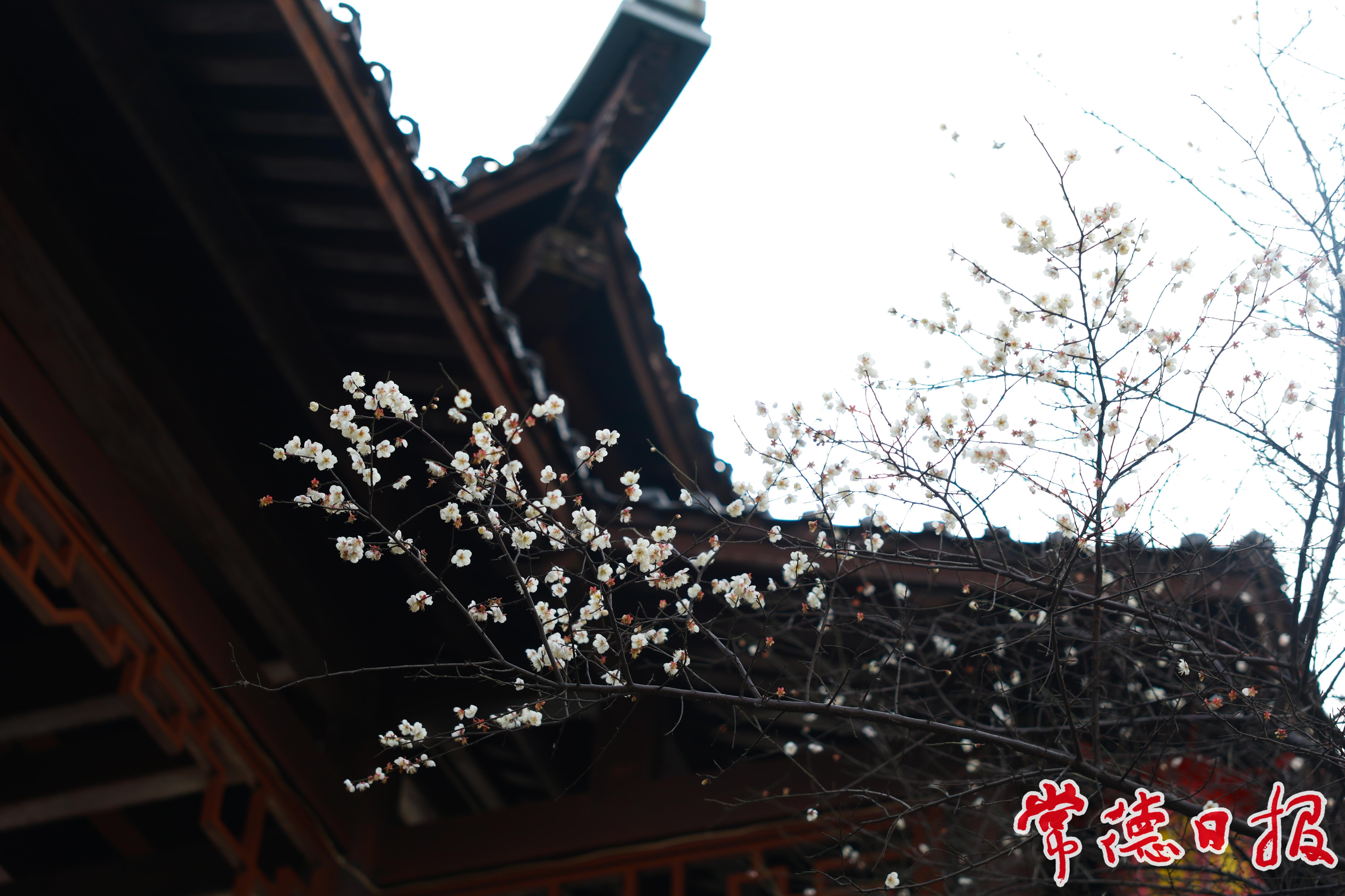暗香浮动,梅花点点,缀于楼阁之上,与飞檐翘角相映,成了冬日里最美的景致