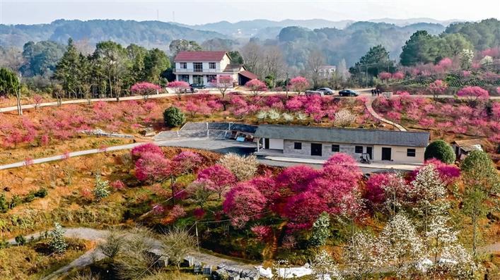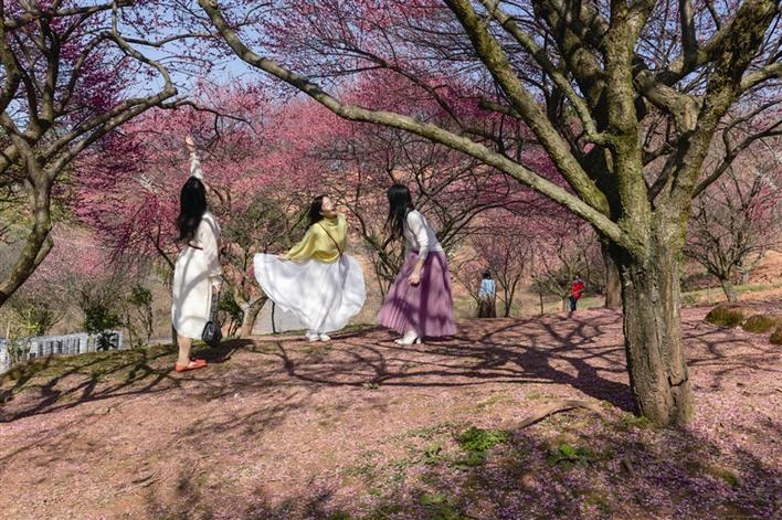 2月18日,桃源县九溪镇兴龙村,踏春的市民在梅花下起舞。 签约摄影师 周桂成 摄