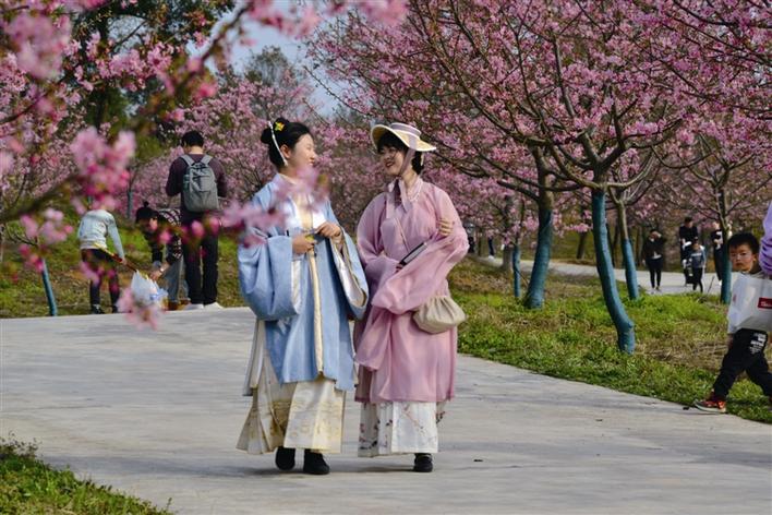 2月22日,蔡家岗樱花园,汉服与樱花相映成趣。 覃吉桃 摄