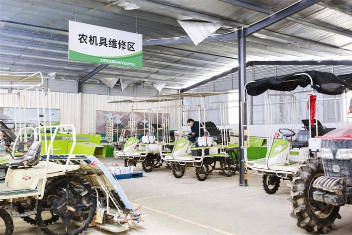 汉寿县金穗农机专业合作社的社员在对农机进行维修和养护。本报记者 李龙 摄