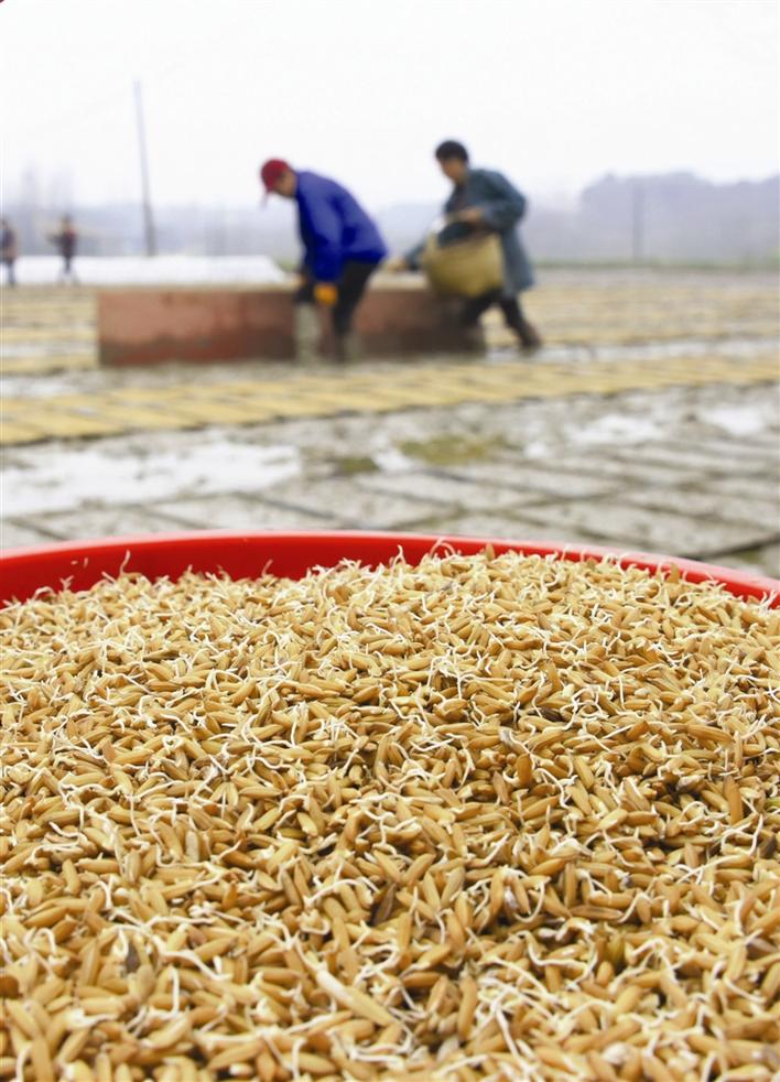 澧县盐井镇伍家岗社区,村民在育秧示范点播种早稻种谷。柏依朴 摄