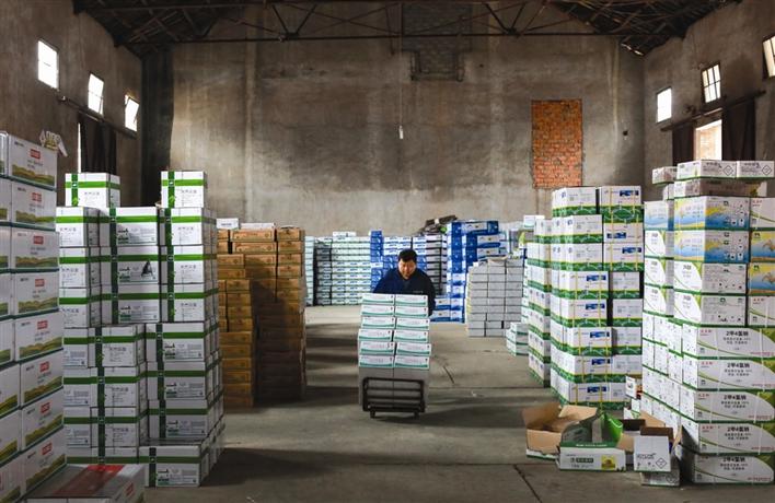 桥南工业园常德湘湘湘农化有限公司工人搬运农资即将发货。 李龙 摄