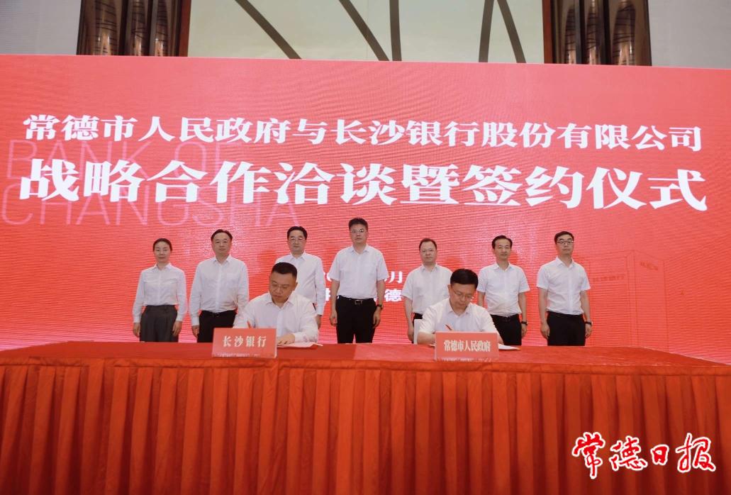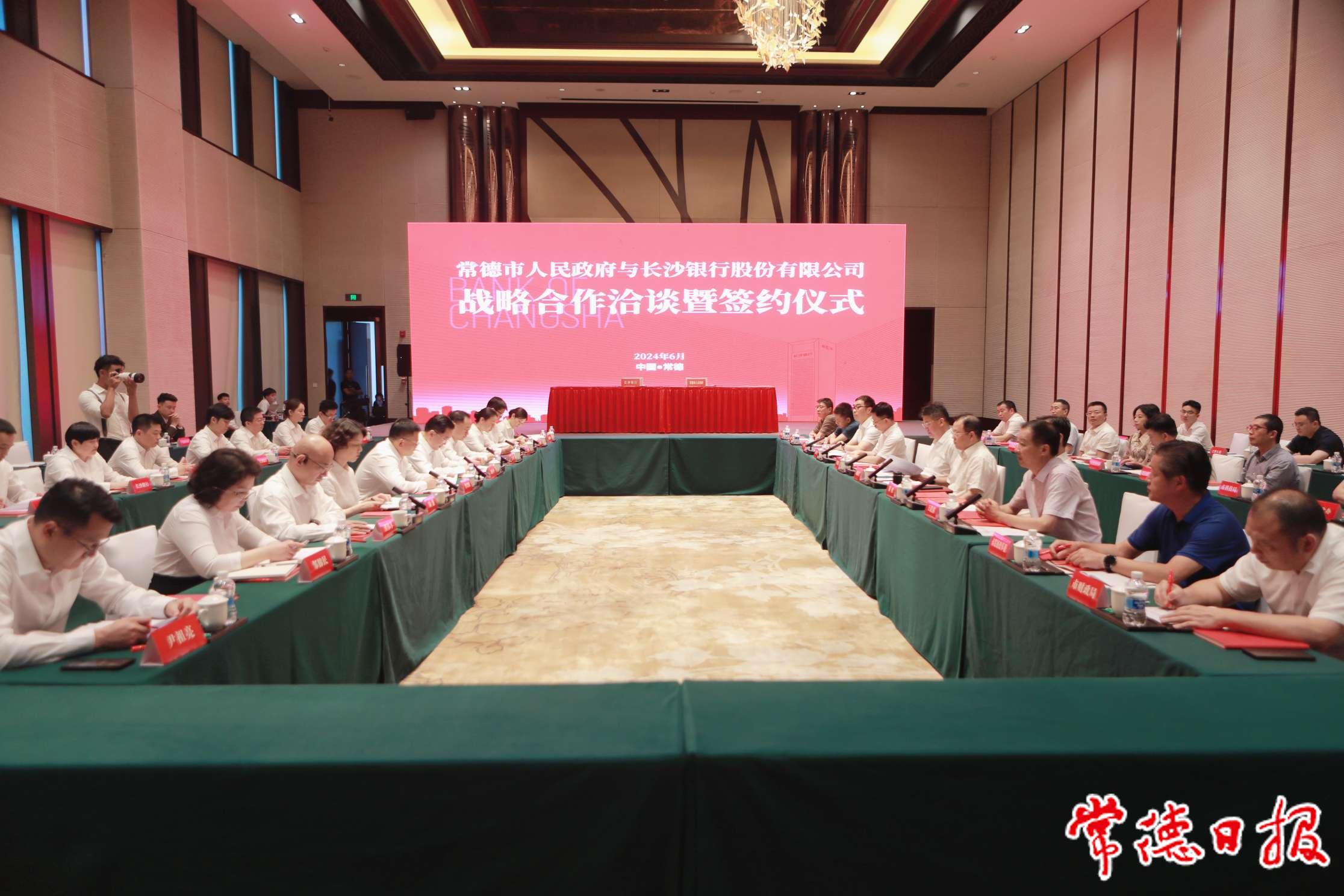 签约仪式前,双方举行了洽谈。罗毅君、周振宇代表市委市政府对长沙银行股份有限公司深耕沅澧大地、服务常德发展表示衷心感谢。他们说,当前,常德正深入学习贯彻习近平总书记考察湖南重要讲话和指示精神,锚定“三个高地”、推进“二次创业”,着力推动轻工纺织、装备制造、食品加工、文化旅游四大传统产业提质升级,聚力培育数字产业、新材料新能源产业、生物制造产业三大新兴产业,迫切需要金融机构的鼎力相助和大力支持。希望长沙银行股份有限公司一如既往助力常德经济社会发展,加大对我市光伏产业、高标准农田建设、绿色矿山修复等重点领域和项目的支持力度。期待双方开展全方位、深层次、宽领域的战略合作,共同谱写政银合作、互利共赢的崭新局面。常德将一如既往为长沙银行股份有限公司在项目建设、金融产品投放等方面提供优质服务和坚强保障,营造一流营商环境,全力支持长沙银行股份有限公司在常德深耕细作、发展壮大。