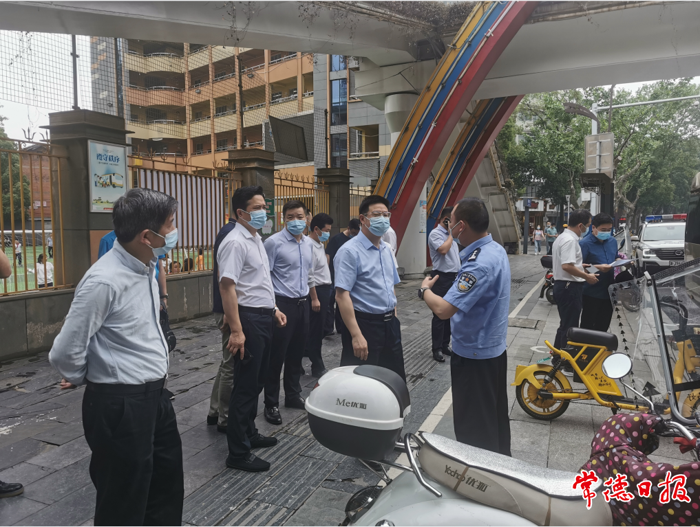 郭碧勋在朗州路北正街小学外查看停车秩序整改情况