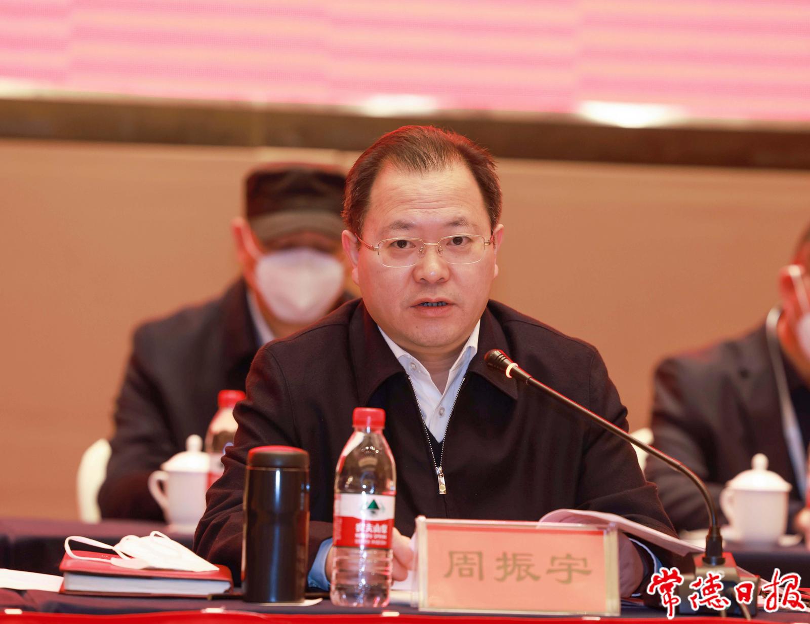 周振宇在致辞中表示,希望全市哲学社会科学战线以本次会议为新起点,始终紧扣中心、服务大局,真正把论文写在常德大地上,将思想政策宣讲到基层、科研论坛举办到园区、调查研究深入到一线;真正把智慧用在常德发展上,围绕产业升级、创新驱动、绿色发展、文化建设等着力点,以一批有影响的“德字号”社科品牌,服务打造一批有地位的“德字号”产品品牌、产业招牌;真正把人才育在常德沃土上,坚持不懈打造社科人才高地,为全市高质量发展和现代化建设贡献社科力量。