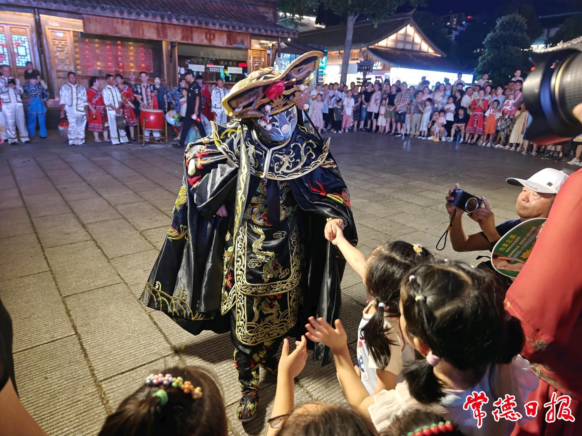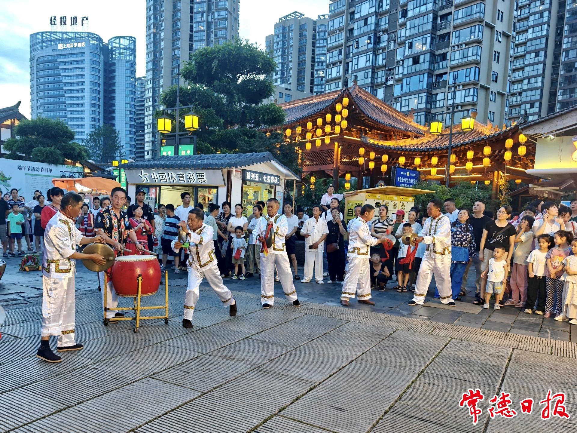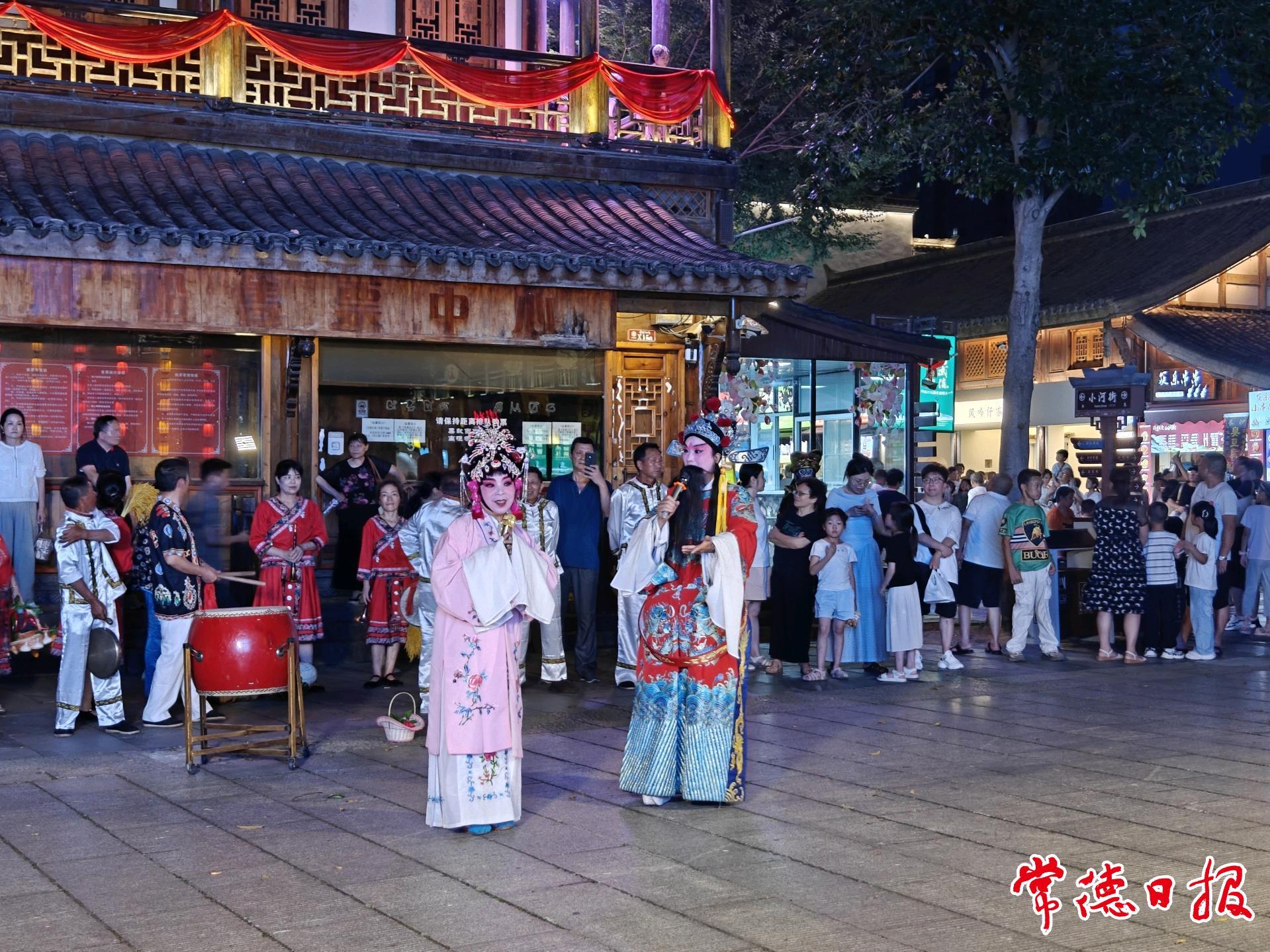“常德是个好地方哟,伊儿哟伊儿哟……”19时15分,常德丝弦悠扬的唱腔拉开了展演的序幕。没有固定舞台,没有明确界限,身着彩衣的演员们刚在神鼎门广场亮相,就被热情的观众团团围住。手持自拍杆的游客踮起脚尖直播,孩童骑在父亲肩头兴奋鼓掌,老人跟着韵律轻声哼唱,掌声喝彩随着丝弦余韵在街巷间流淌。