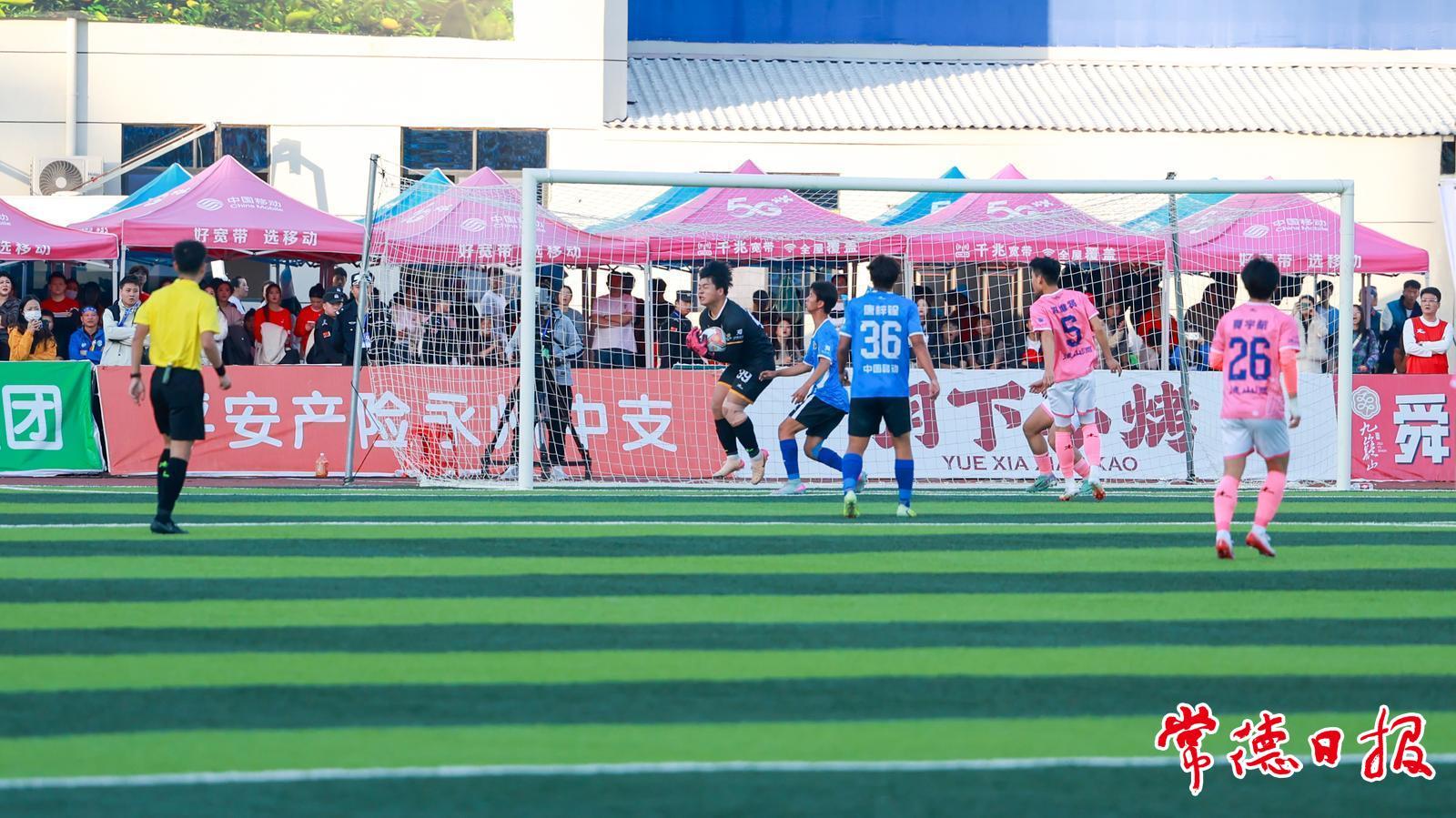 常德队发起接连几轮进攻,攻势凌厉,颇具威胁。永州队门将面对常德队来势汹汹的进攻,积极出击,飞身扑救,每一次拼抢都竭尽全力,全力捍卫己方球门