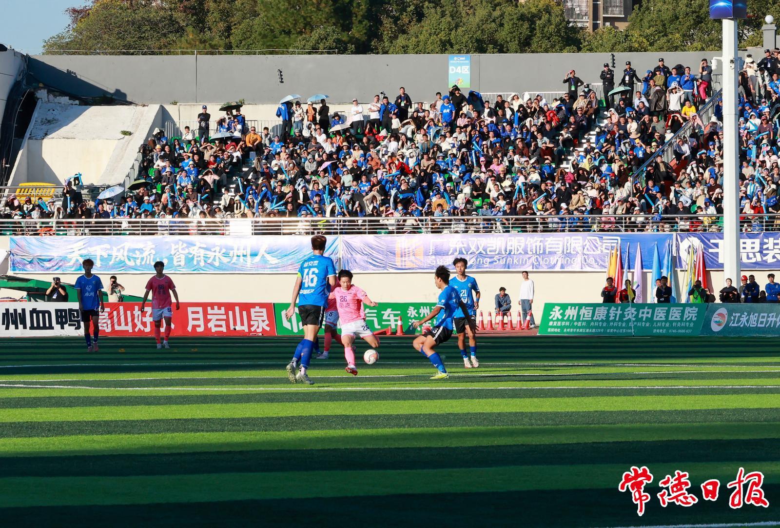 比赛进行到第26分钟,常德队球员赵文荻利用前场任意球的机会,攻破永州队球门,双方1∶1战平