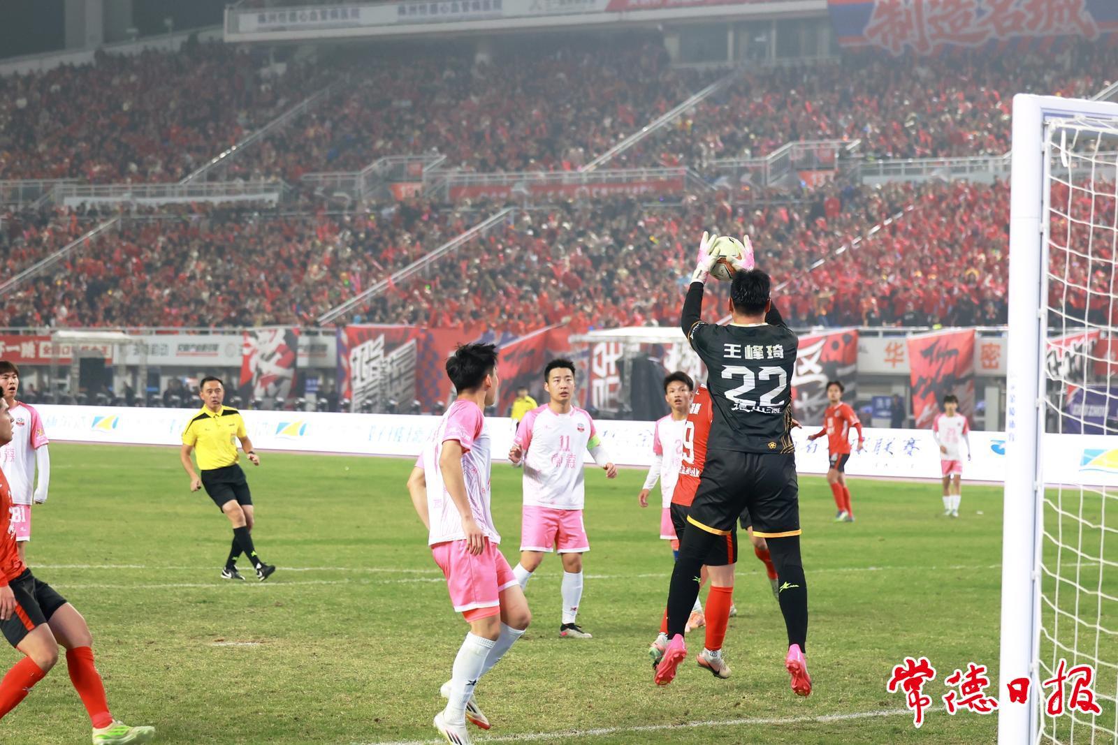 常德队守门员王峰琦高高跃起接住足球