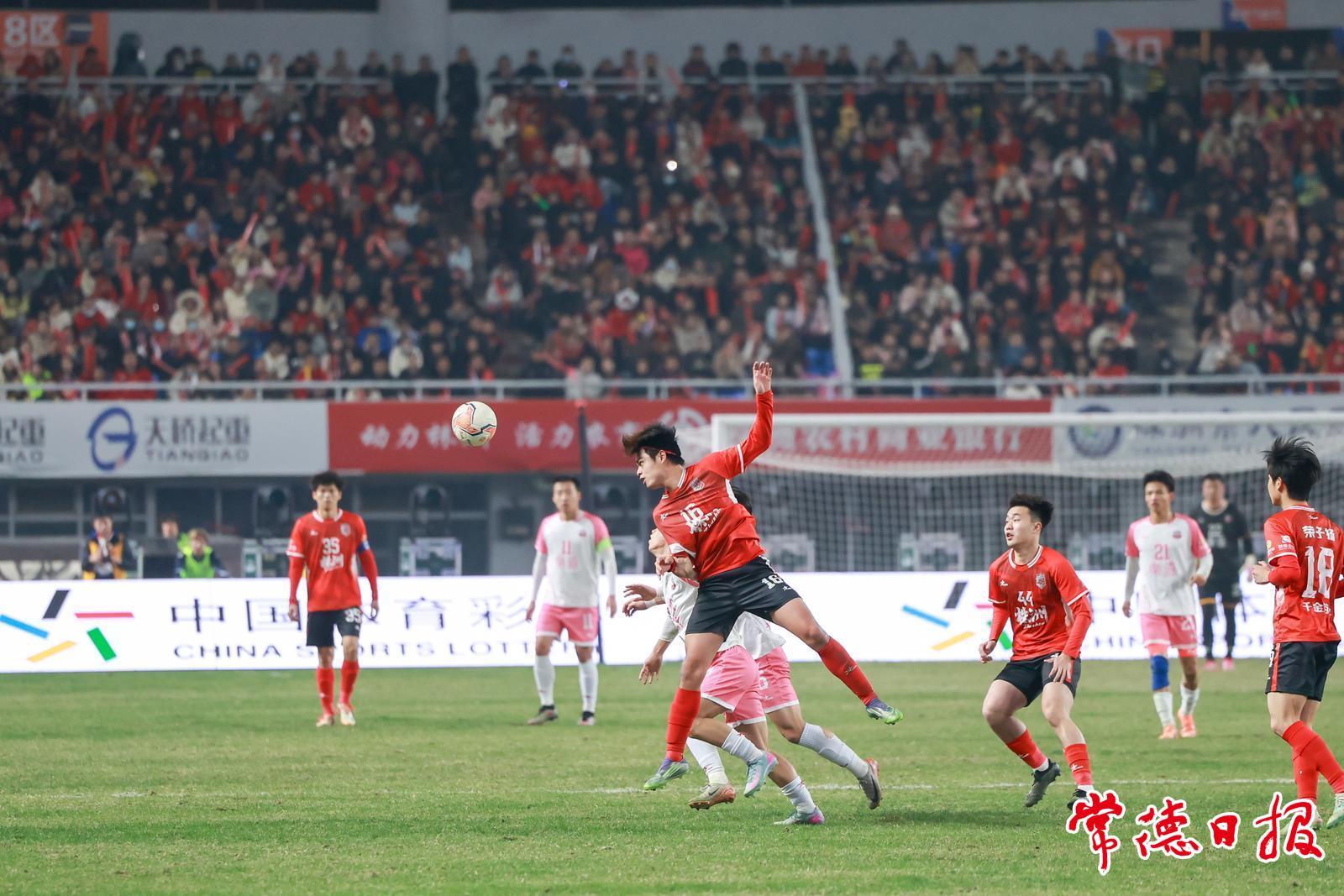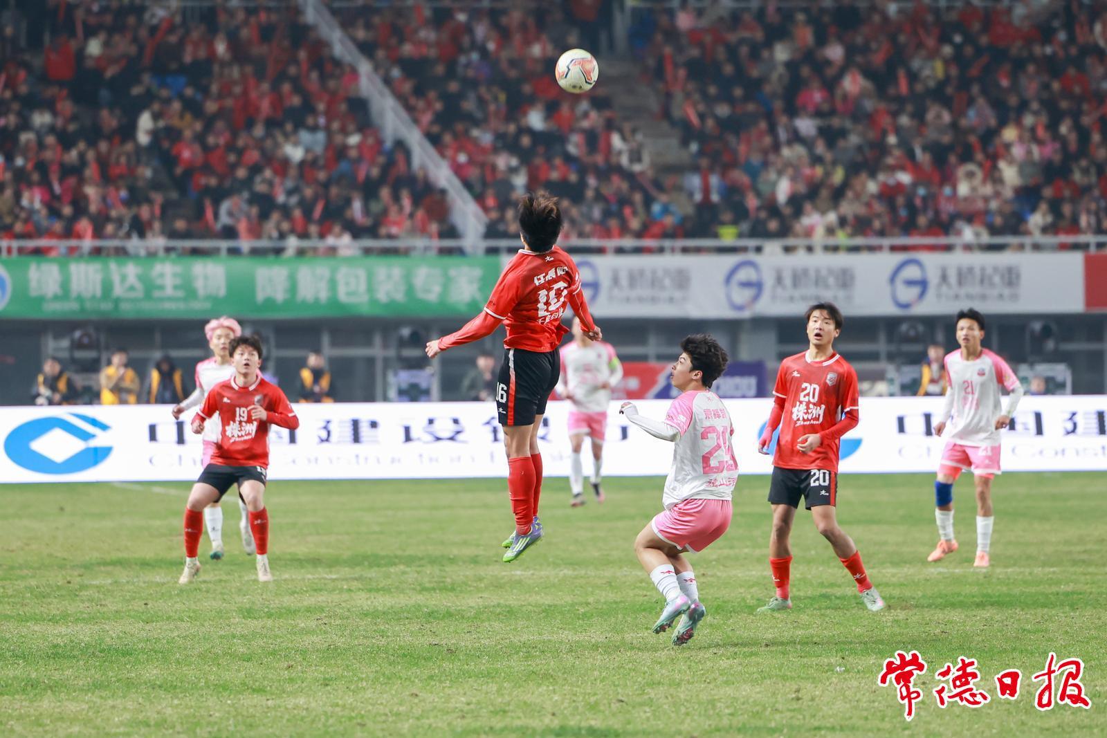 足球如炮弹般朝着常德队球门呼啸而来,一名常德球员瞅准时机,将球顶向远离球门的方向