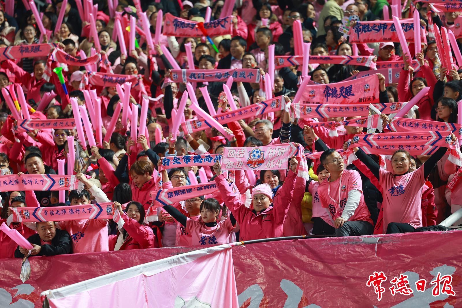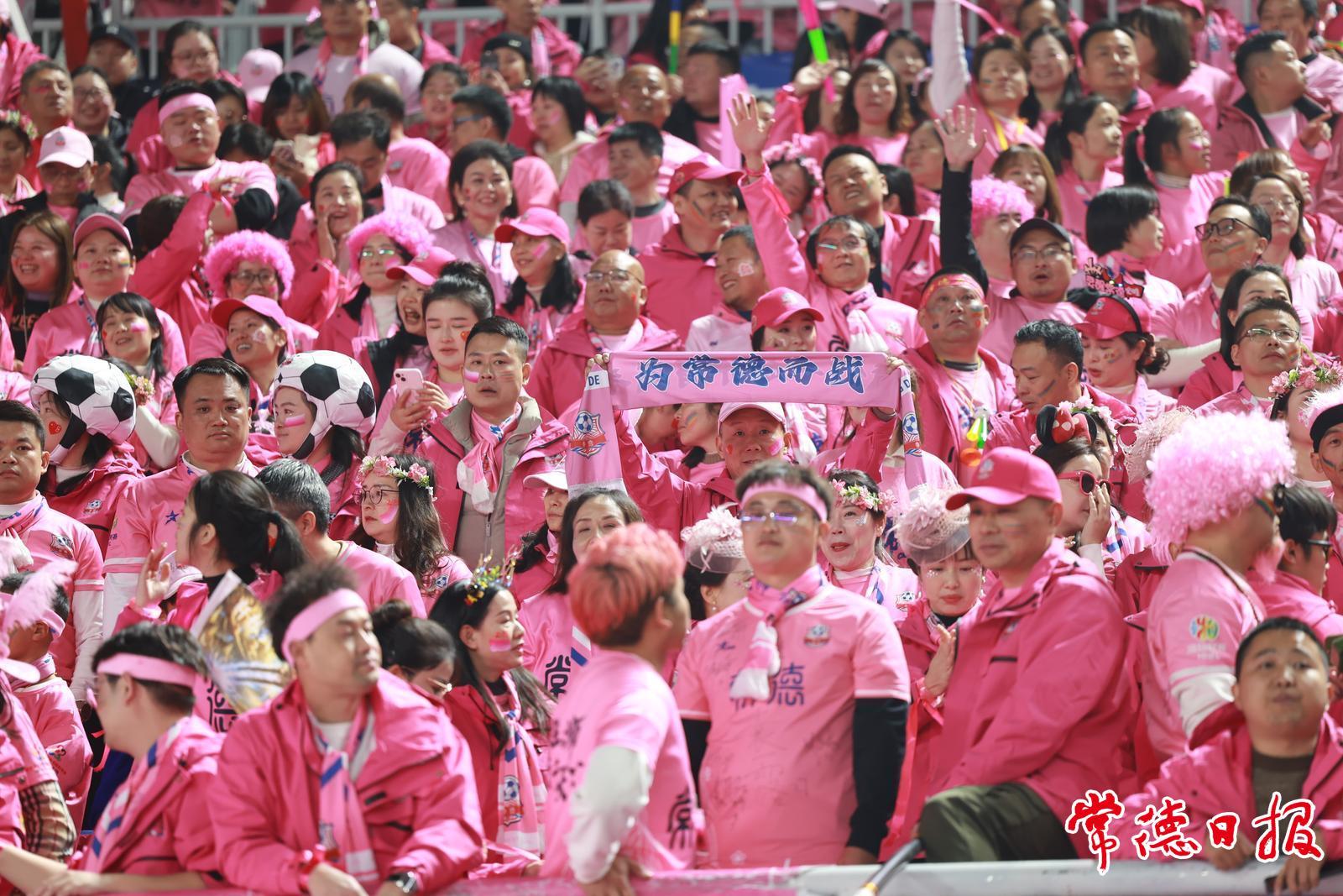 看台上,常德球迷助威团手持粉色应援棒与标语牌,形成整齐的“粉色助威方阵”
